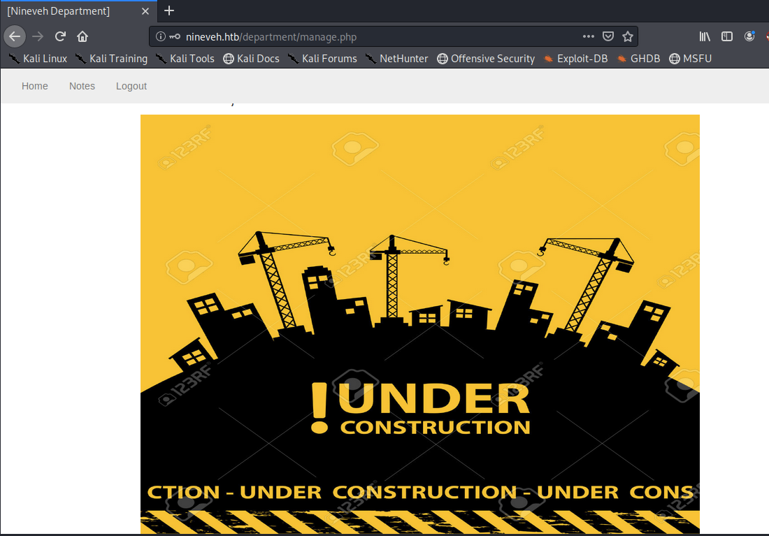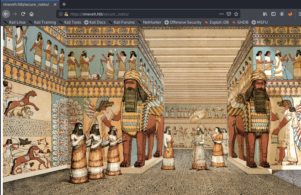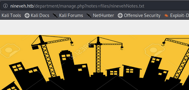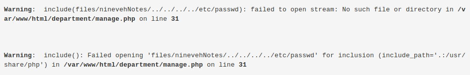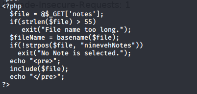 I’m back to the “No Note is selected” message. This leads me to believe that it is vulnerable to LFI, however, there is a check on the backend that is grepping for the string “ninevehNotes” since my query doesn’t work without it.