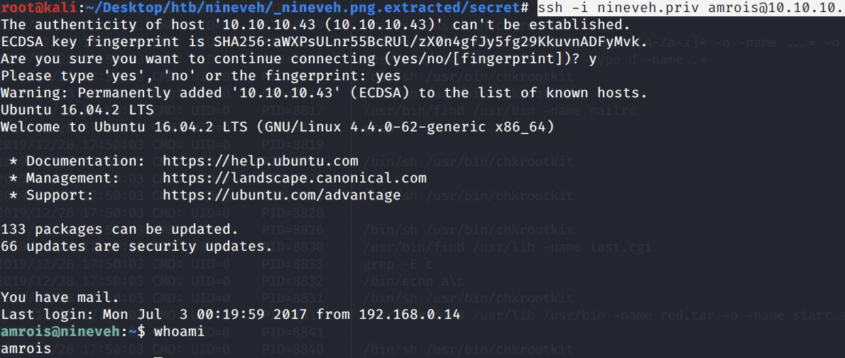 It worked! Now you could SSH into amrois’s account using the private key we found.
