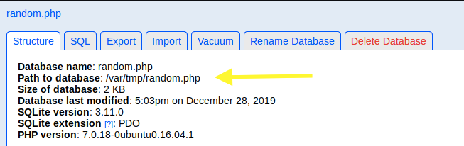 PHP code injection in the phpLiteAdmin page that allowed us to store a malicious file on the server. This could have been avoided if the user had patched the system and installed the most recent version of phpLiteAdmin.