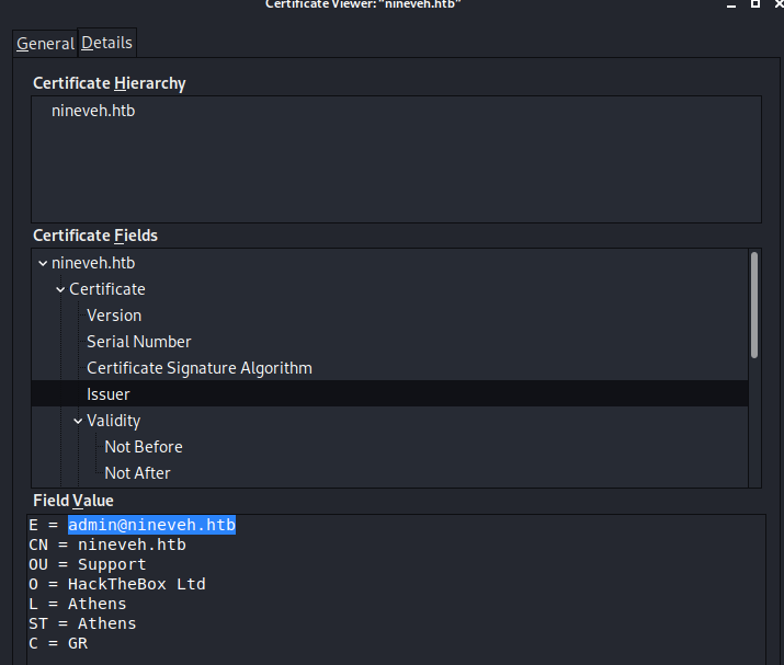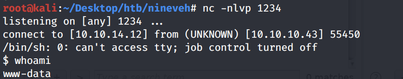 We get back two files: nineveh.priv and nineveh.pub. When I find private keys the first thing I try is SSH-ing into the user’s account using the private key. However, if you remember, nmap did not report an open port that was running SSH. This brings us to the second thing we found during our privilege escalation phase that we didn’t look into.