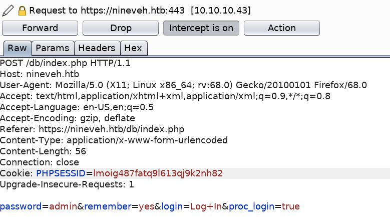 I tried the default password “admin” for phpLiteAdmin v1.9 but that did not work. Let’s try brute-forcing the password. First, intercept the request in Burp.