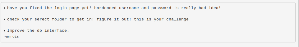 We find a comment that might be useful later. We have two possible usernames admin and amrois. Let’s try the usernames on the login form.