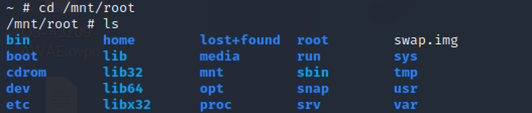 However, we mounted the host “/” directory to the directory “/mnt/root” in the alpine container. So if we visit “/mnt/root”, we can see the content of the “/” directory of the host OS.