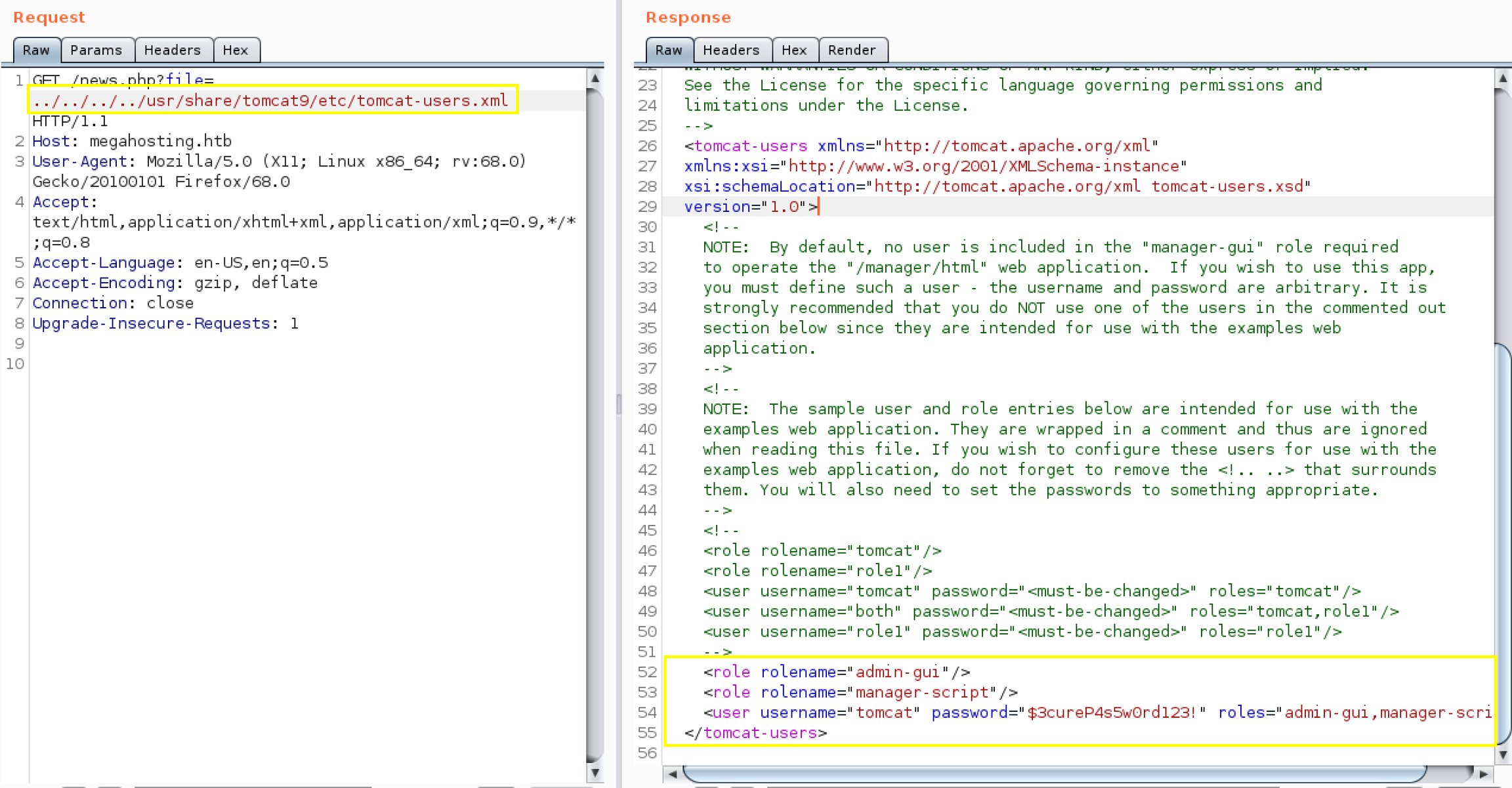 As can be seen in the above figure, there’s a user with the username “tomcat” and the password “$3cureP4s5w0rd123!”. The user also has the roles “admin-gui,manager-script”. Looking at the tomcat documentation, the following are the descriptions of the roles: