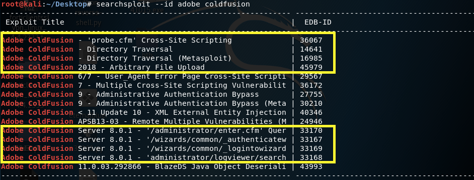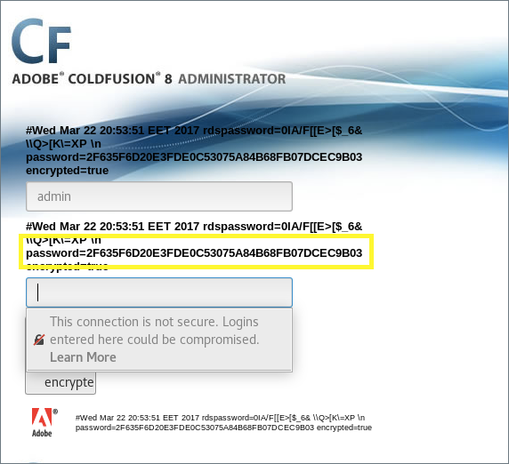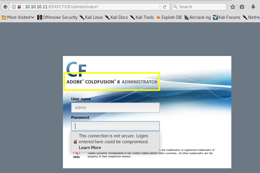 The login page does tell us that it’s using Adobe ColdFusion 8, which is a web development application platform. We’ll use the platform name to see if it contains any vulnerabilities.
