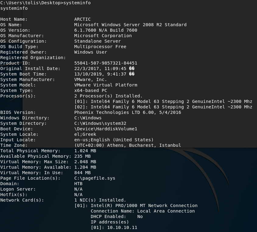 Copy the output of the systeminfo command and save it in a file. We’ll use Windows Exploit Suggester to identify any missing patches that could potentially allow us to escalate privileges.