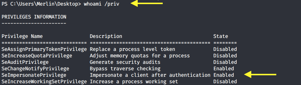 SetImpersonatePrivilege is enabled so we’re very likely to get SYSTEM using Juicy Potato. Users running the SQL server service or the IIS service usually have these privileges enabled by design. This privilege is designed to allow a service to impersonate other users on the system. Juicy Potato exploits the way Microsoft handles tokens in order to escalate local privileges to SYSTEM.