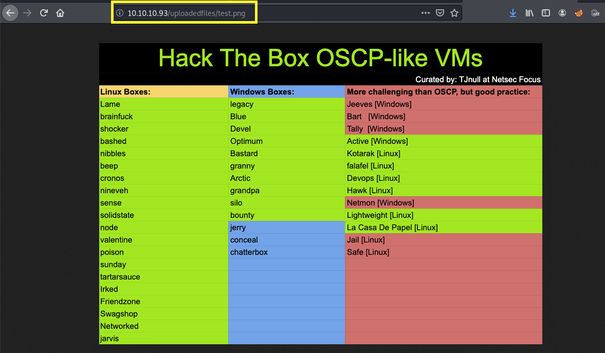 We get a “file uploaded successfully” message. We can view the image in the uploadedfiles directory that our original gobuster scan found.