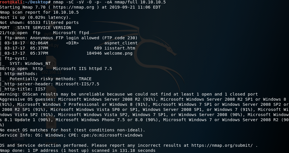 We get back the following result showing that port 80 is open with Microsoft IIS web server running on it and port 21 is open with FTP running on it.