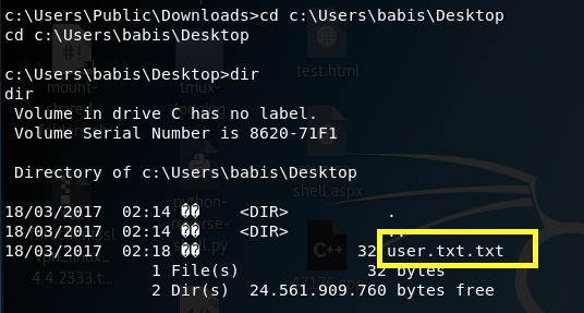 We have system! Navigate to the user.txt file and output its content to get the user flag.