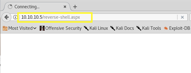 In the web browser load the reverse-shell.aspx file we uploaded in the FTP server.