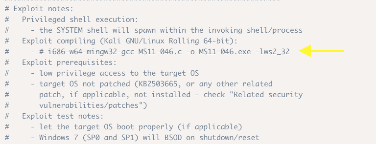 The first two exploits displayed allow us to escalate privileges. The second exploit (MS11–046), has documentation on how to compile the source code, so we’ll go with that one.