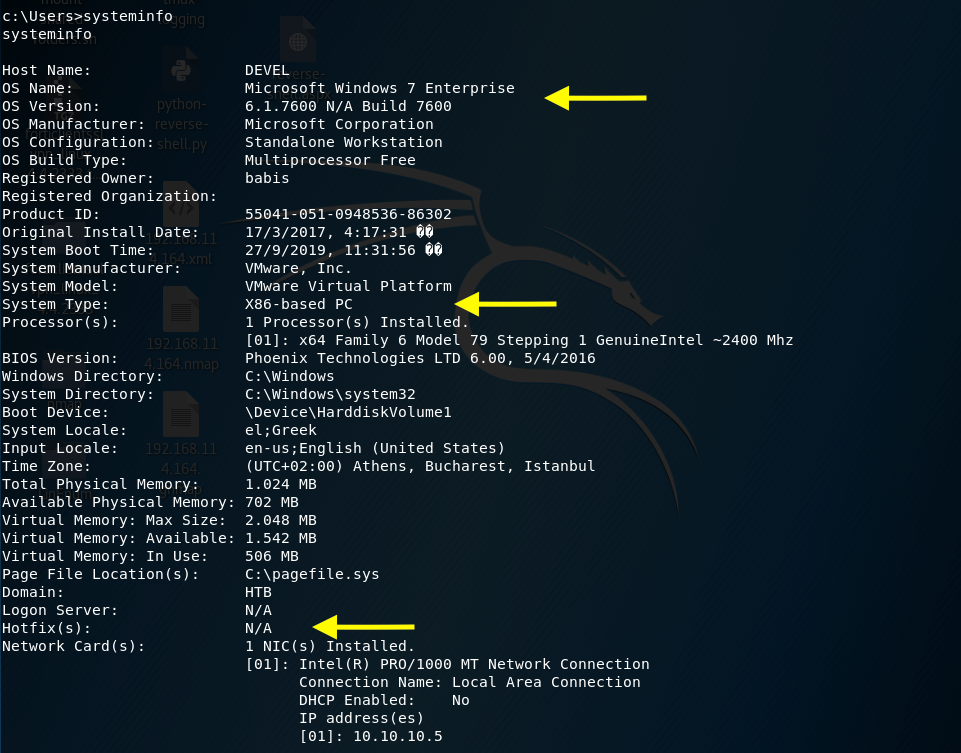 We’re on a Microsoft Windows 7 build 7600 system. It’s fairly old and does not seem to have been updated, so it’s probably vulnerable to a bunch of exploits.