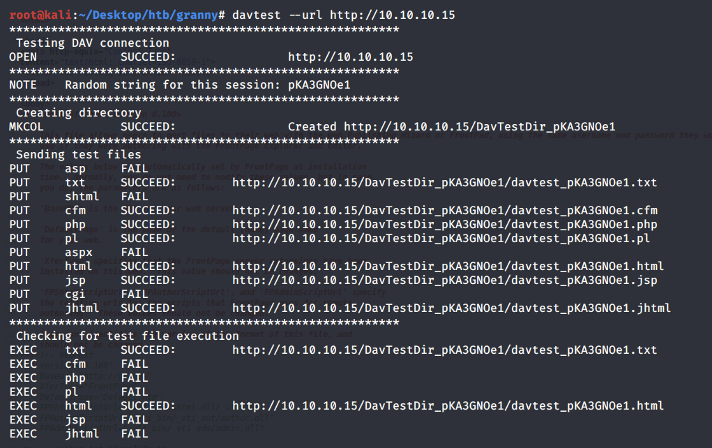 The scan shows that the HTTP PUT method is allowed. This could potentially give us the ability to save files on the web server. Since this is a Microsoft IIS web server, the type of files it executes are ASP and ASPX. So letโs check if weโre allowed to upload these file extensions.