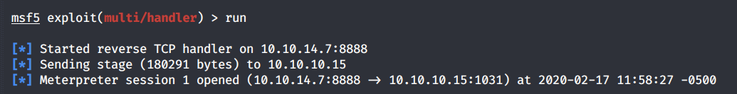 Then use the โrunโ command to start the reverse tcp handler. In the browser, execute the met-shell.aspx payload and wait for a session to open up in Metasploit.